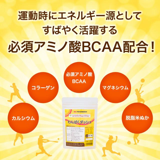 商品情報 身体をつくり、運動時のエネルギー源にもなる必須アミノ酸BCAA(バリン・ロイシン・イソロイシン)を黄金比率で配合。さらに、スポーツジュニア発育に役立つカルシウム・コラーゲン・マグネシウム・米ぬかを詰め込んでいます。 「他の子より疲れていないか心配だ…」 「毎日、かなりハードな練習(トレーニング)をしているけど大丈夫…」 そういった悩みがある方にもおすすめです。 プロテインだけではダメ! ご存知でしょうか? もし、子どもがスポーツをしていなかったとしても成長期、特に12歳〜14は、他のどの年代と比べても最も多くの「たんぱく質・カルシウム・鉄分」を摂取しなくてはいけないことを。 つまり、大人以上の栄養素が必要なのです。(厚生労働省「日本人の食事摂取基準」より) スポーツをする子どもはエネルギー消費が激しいので、それ以上の栄養が必要になります。 運動量が多く栄養補給が追いつかない状態では、健全な発育を阻害しかねません。 プロテインだけで丈夫な身体は作られません。 わんぱくダッシュは、ジュニアアスリートの成長にとって重要なのに不足しがちな栄養素を最適なバランスで配合しています。 |