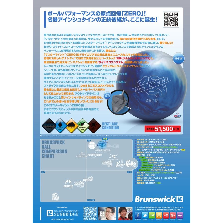 商品情報 ∞ マスターマインド・ZERO ∞ ボールメーカー:ブランズウィック 本体価格:51,500円(税別) ボールカラー:ディープブルー・ブルー・シルバーパール カバーストック:UR(ウルトラレスポンシブの略。) コア:マスターマインド・低・RG・コア + ダイナミコア(ニューコア) 表面加工:#500マイクロパッド → #1000 → クラウンコンパウンド 硬度:73〜75 RG Min:2.488(15P) RG Diff:0.052(15P) RG Asy(アシメトリックディファレンシャル):0.015 フックポテンシャル:215(MAX:300) レングス:135(MAX:235) フレアポテンシャル:0.052(MAX:0.060) ウェイト:13P〜15P 適性レーンコンディション:ミディアムドライ〜ミディアムヘビー 発売日:2018年5月 ※ ブランズウィックのディファレンシャルコントロールは、 ポンドによるRG Diffのバラつきを極限までなくし、数値の均一化をはかっています。 |